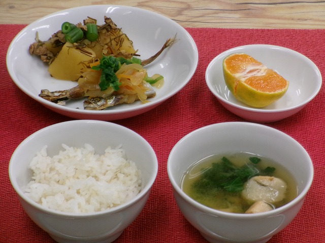 ごはん ししゃも(白身魚)の南蛮漬け じゃが芋と切り昆布の煮物