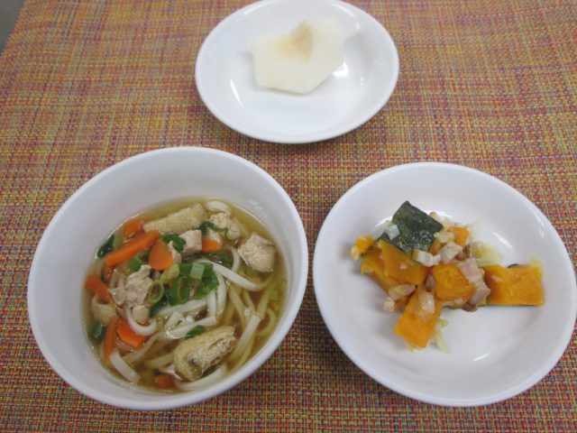 冷やし肉汁うどん 南瓜のベーコンサラダ
