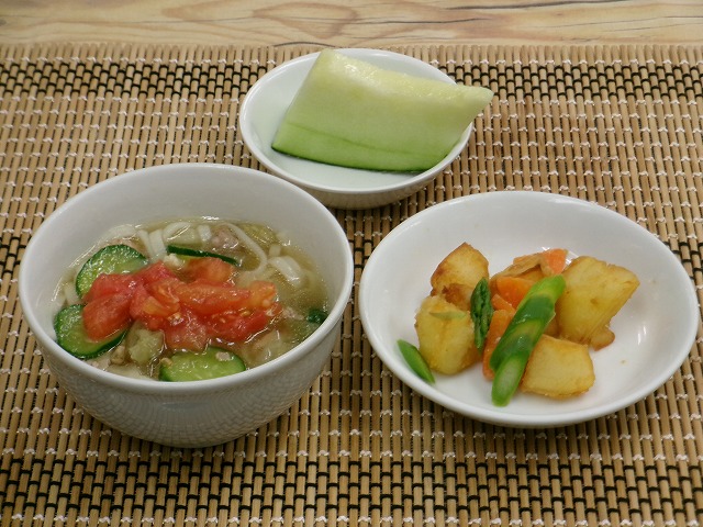 夏野菜肉うどん 揚げ芋の味噌がらめ