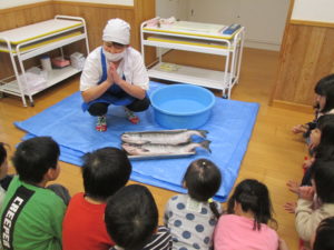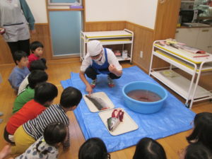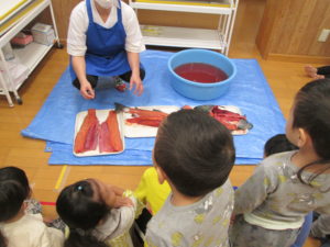 収穫祭では“たくさんの生命に命をいただいていることを知る”体験の一つとして、当園の調理師が鮭をさばく様子を見られるように準備しています。